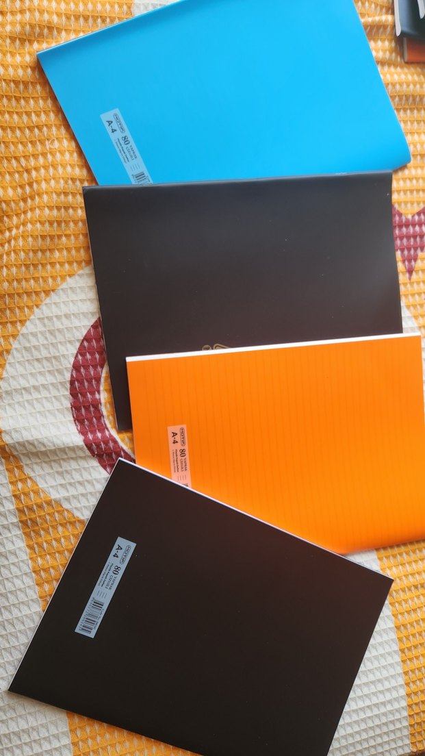 Mavi, siyah ve turuncu kapaklı, canlı renklerde A4 boyutunda defter seti. Tekli Fiyatı 50 TL, toplu alınırsa 200 tldir