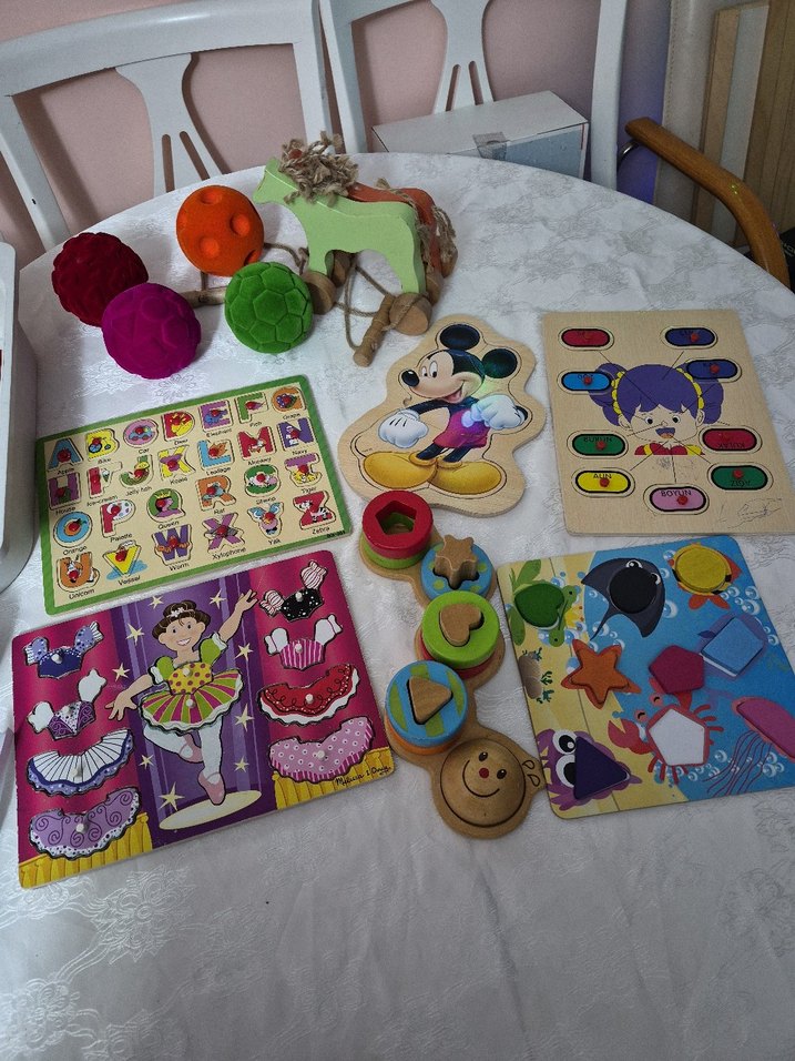 Çok renkli ahşap eğitici oyuncak seti, yapbozlar, üst üste dizme halkaları ve karakter şekilleri içeriyor. 11 parça