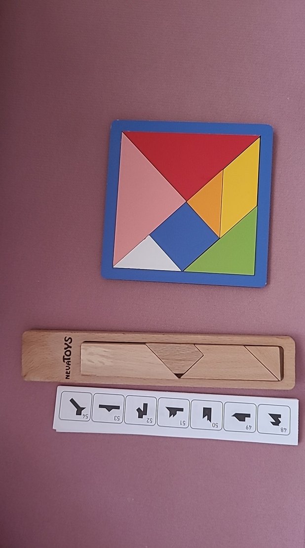 Çok renkli ahşap tangram, yedi geometrik parçasıyla mekansal farkındalık ve problem çözme becerilerini geliştirir.