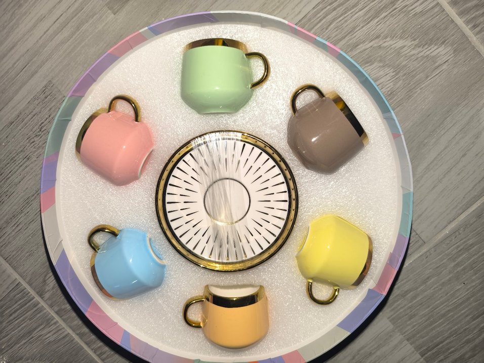 altın detaylı kulplu ve kenarlı, altı farklı renkte hafif renkli fincan ve uyumlu tabak seti. ☕