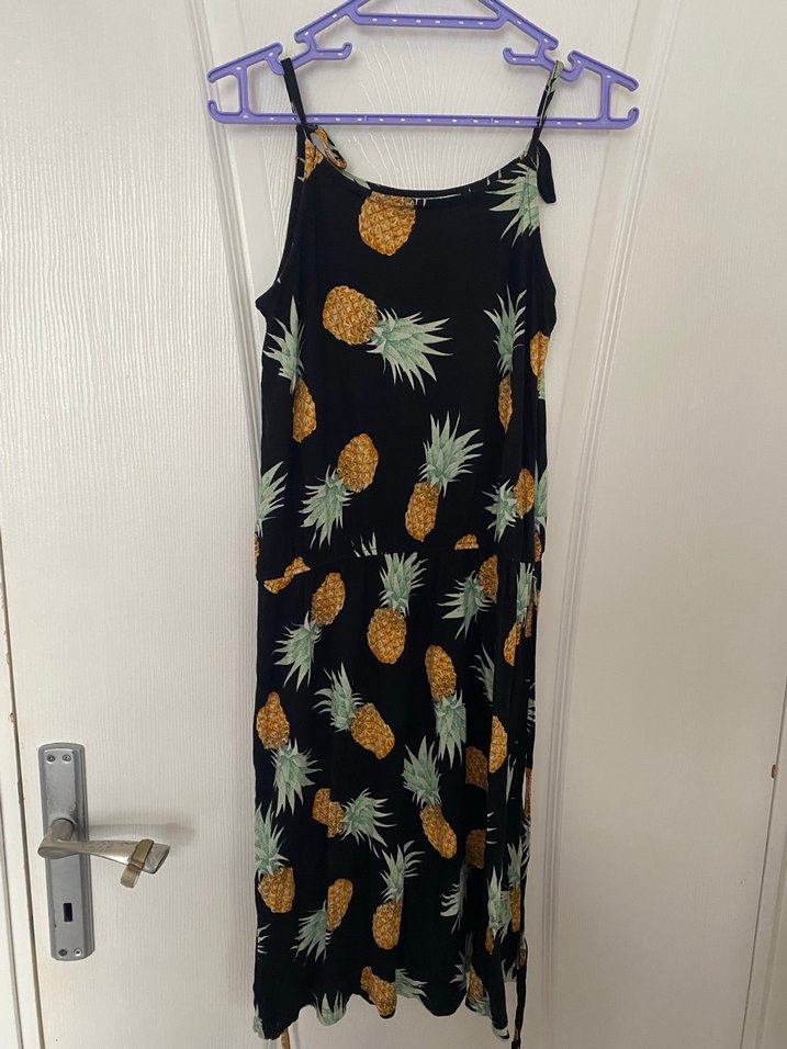 Askılı, bol kesim, drapeli, çok renkli ananas desenli, uzun, sentetik kumaştan elbise.