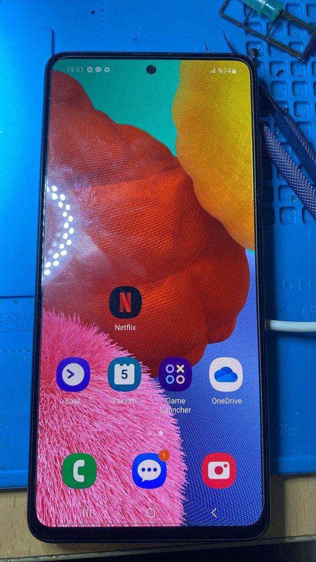 Koyu renkli, çok renkli ekrana sahip Android telefon, Netflix ve OneDrive gibi uygulamalar gösteriyor. Ekran canlı ve net. Kozmetik olarak güzel durumda hiç bir sorunu yoktur parmak izine kadar herşey aktif