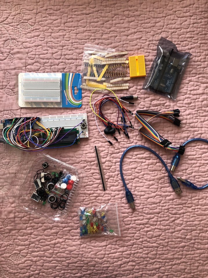 Bu Arduino geliştirme seti breadboard, jumper kablolar, dirençler, LED'ler, butonlar ve Arduino kartı içerir. Elektronik projeler için çeşitli parçalar sunar.