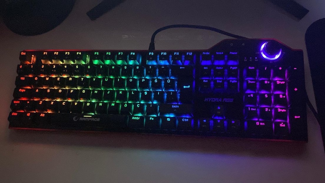 Koyu renkli oyuncu klavyesi, çok renkli aydınlatmaya sahip olup oyun sırasında görünürlük ve şıklık sağlar. Tam tuş takımı ve oyun fonksiyonları bulunur. Hem oyun hem de günlük kullanım için ideal olan bu klavye, sağlam yapısı ve Rampage Red Switch'leri sayesinde hızlı tepkime ve tatmin edici bir tıklama hissi sunar. Klavyenin tüm tuşları sorunsuz çalışmakta olup, görsel olarak da sfır durumdadır. Kutuludur. Diğer klavyeye göre ek özellikler: • Kişiselleştirilmiş Multimedya tuşları • 12 renk adreslenebilir rgb canlı renklere sahip ledler - 8 farklı rgb modu - noktasal tuş seçeneği - metal kasa - mıknatıslı bilek desteği - mavi switche göre daha tok ses çıkaran red switch