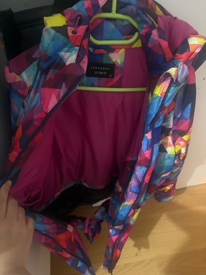 Fermuarlı, straplez yakalı ve askılı kollu, çok renkli bağlama desenli, normal uzunlukta ve vücuda oturan hamile mont. Dış mekan kullanımı için uygundur.