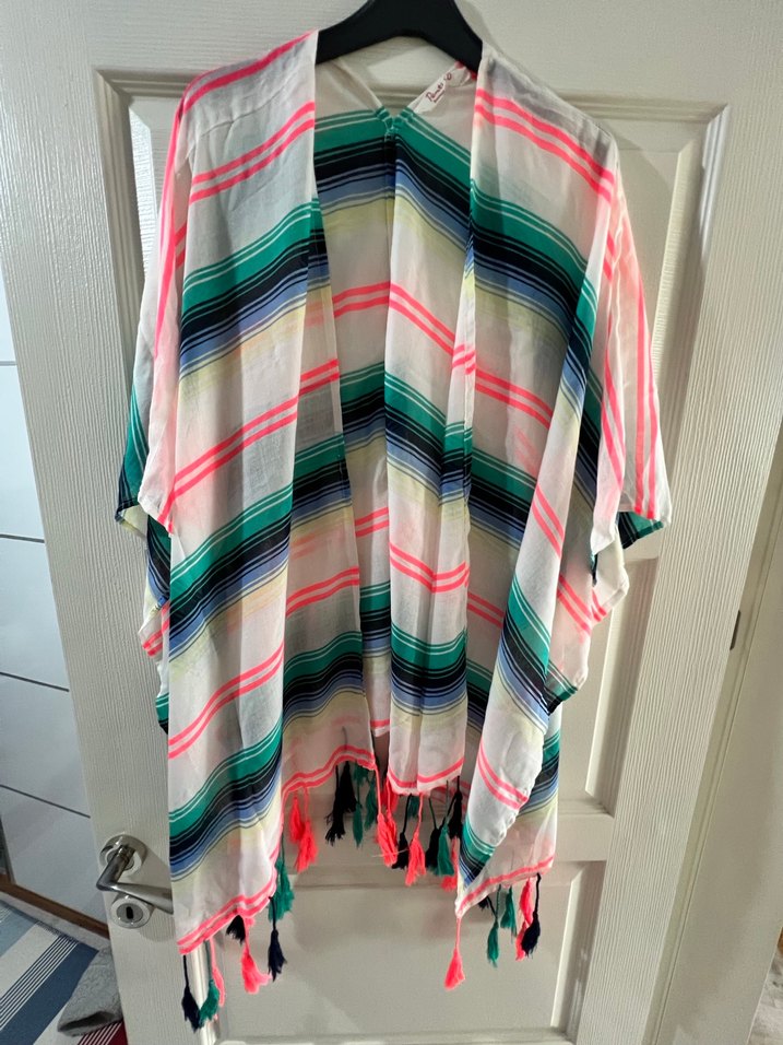 Çok renkli bağlama desenli, kısa kollu, bol kesim plaj panço. Yumuşak sentetik kumaştan, püskül detaylı, salaş ve bohem tarzda.