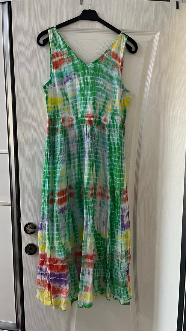 Kolsuz ve straplez uzun elbise, çok renkli bağlama deseni ve pileli detaylara sahiptir. Tekstil kumaştan, bol kesimdir, günlük kullanım için uygundur. Yurt dışından geldi hiç kullanılmadı
