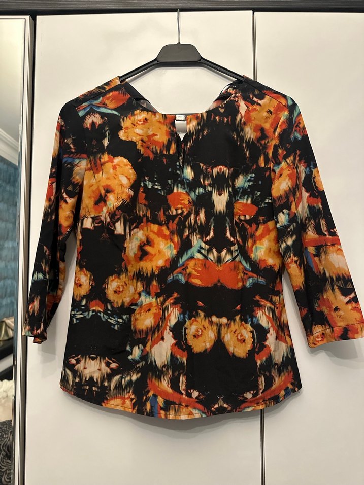 Çok renkli bağlama desenli, bol kesim, yuvarlak yaka uzun kollu bluz. Düğme detaylı, sentetik kumaştan günlük kullanım için uygun.