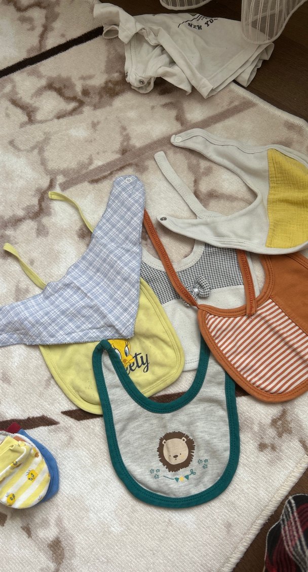 Bağlamalı, çok desenli bebek önlükleri, yumuşak ve rahat kumaştan üretilmiştir.
