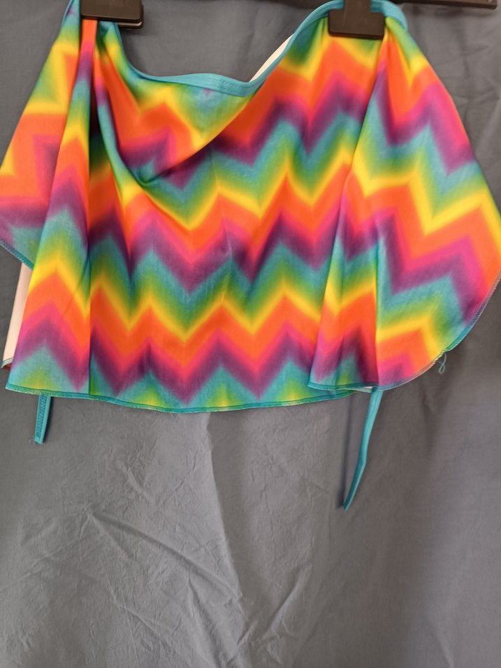 Kızlar için çok renkli tie-dye desenli, bol kesim ve fırfırlı panco. Askılı, straplez yakaya sahip ve sentetik kumaştan üretilmiştir. veya etek