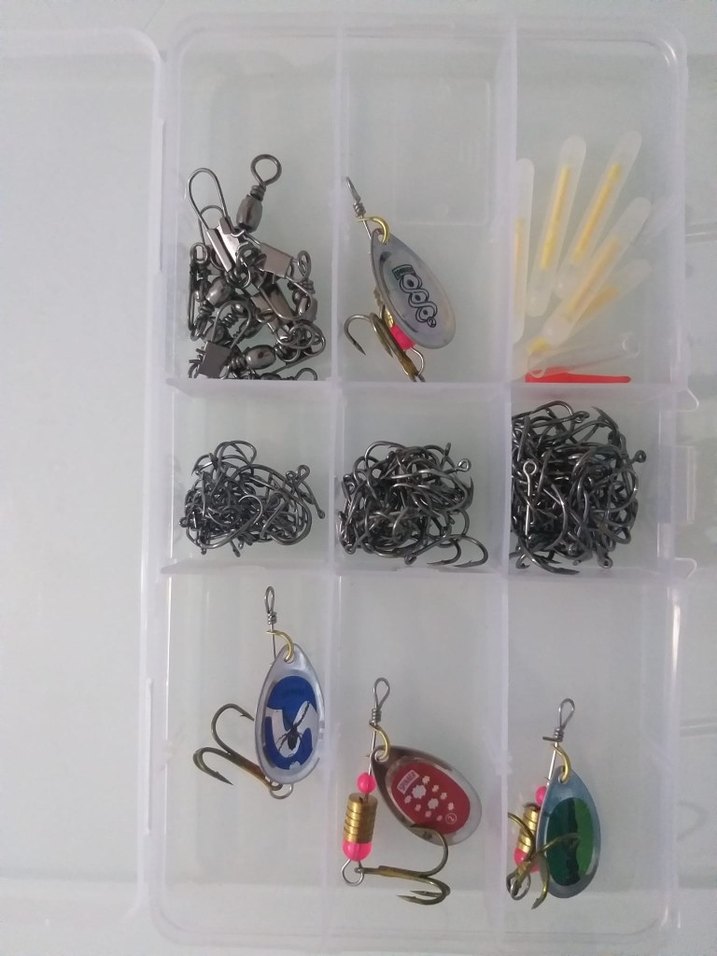 Şeffaf kutuda çeşitli kanca, makara, yem ve şamandıralardan oluşan çok renkli balıkçılık seti.