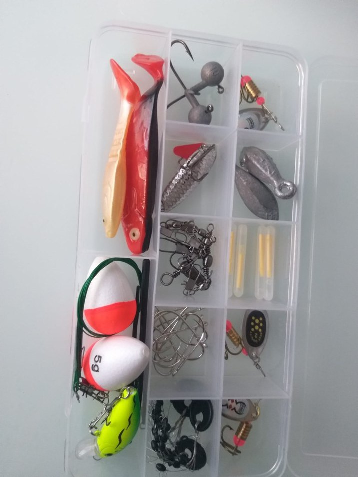 Çeşitli kanca, yem, ağırlık ve şamandıralardan oluşan çok renkli balıkçılık seti, plastik kutuda düzenli şekilde.