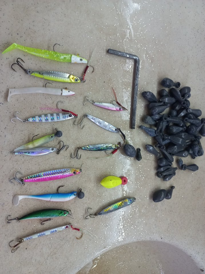 Çeşitli balıkçılık teknikleri için çok renkli yemler ve siyah kurşunlar ile birlikte metal bir alet.