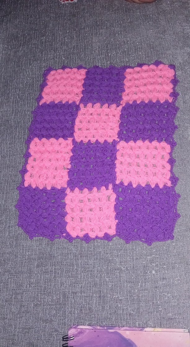 Mor ve pembe kare desenli, dokulu tasarıma sahip çok renkli banyo lifi.#çeyiz#lif#pembe#mor
