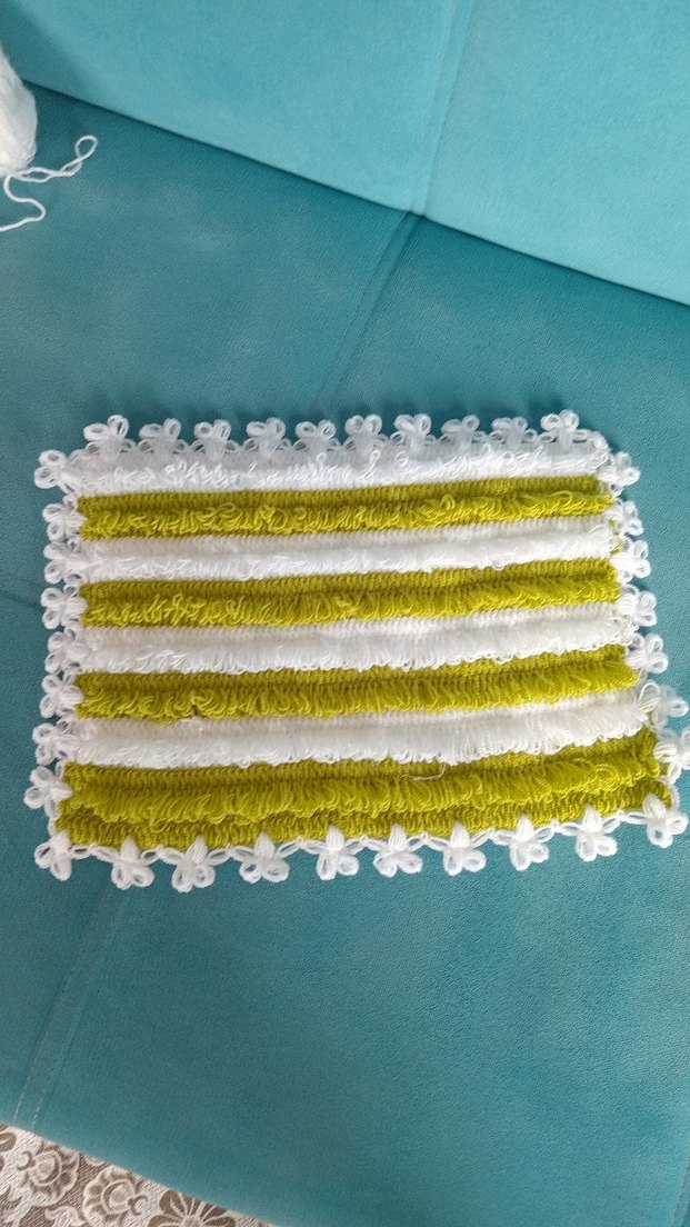 Çok renkli, beyaz dantel kenarlıklı, şerit desenli banyo süngeri.