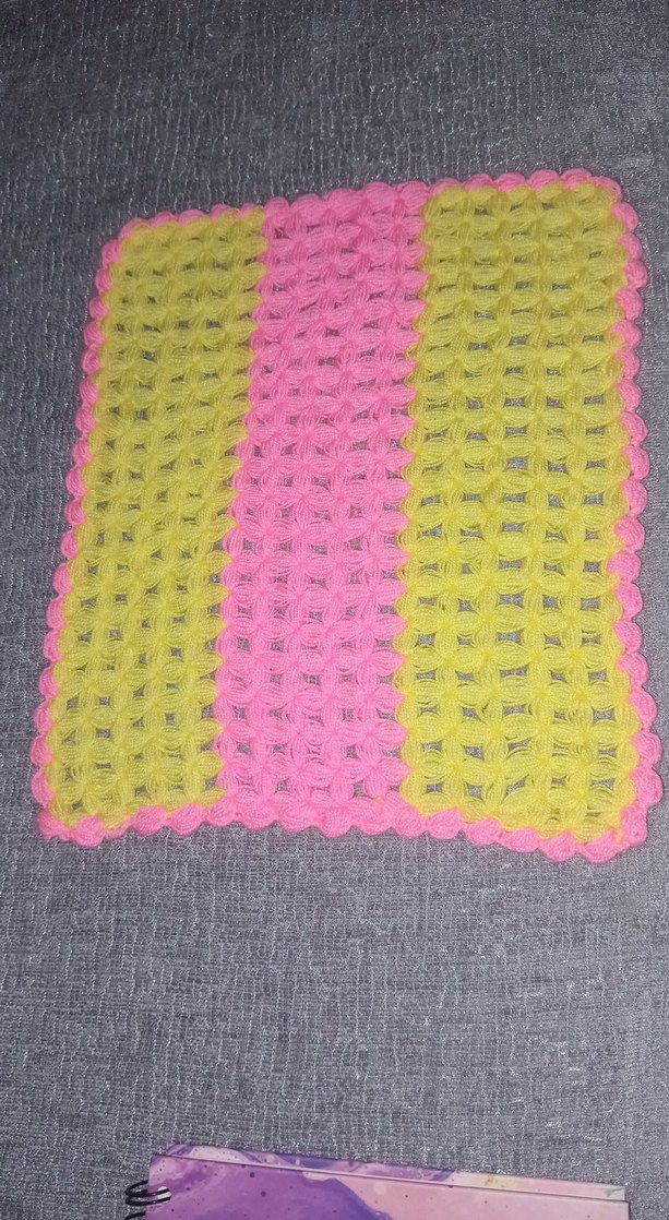 Sarı ve pembe şeritli çok renkli, dokulu yüzeyiyle nazikçe peeling yapan banyo lifi. el örgüsü.#çeyiz #lif