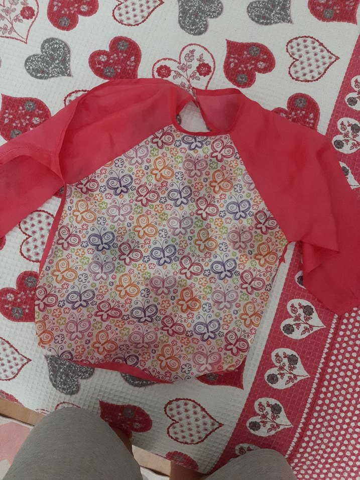 Uzun kırmızı kollu, çok renkli kelebek desenli, tam koruma sağlayan bebek önlüğü.