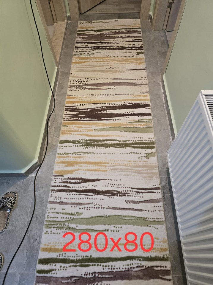 280x80 cm ölçülerinde, açık tonlarda çok renkli baskılı çağdaş halı. Modern tasarımda doğal renkler içerir.
