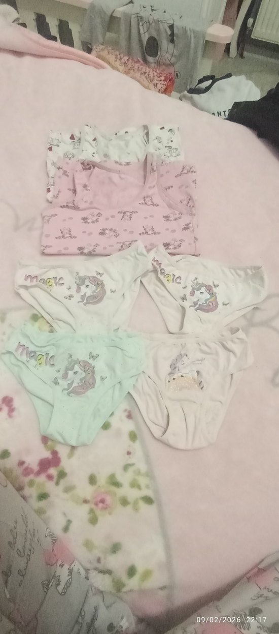 Pastel renklerde, sihirli unicorn baskılı çocuk iç çamaşırları seti. Yumuşak ve rahat kumaştan üretilmiştir. 2 atlet 4 tane külot az giyilmiş deformeleri yok 4 5 yaşlara göre hepsinin fiyatıdır hepsi pamuklu kumaştır