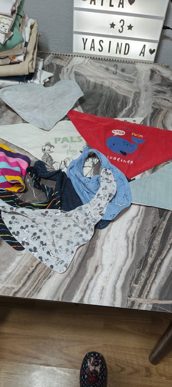 hepsi 25 TL Yumuşak tekstil kumaştan yapılmış, çeşitli baskılı desenlere sahip çok renkli çocuk önlükleri. Birinde "PAL" yazısı bulunur.