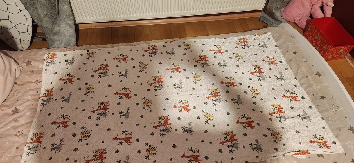 Hafif çok renkli baskılı tekstil kumaştan yapılmış çocuk pikesii, yumuşak ve rahat dokusu ile dikkat çeker. 100×150 cm.