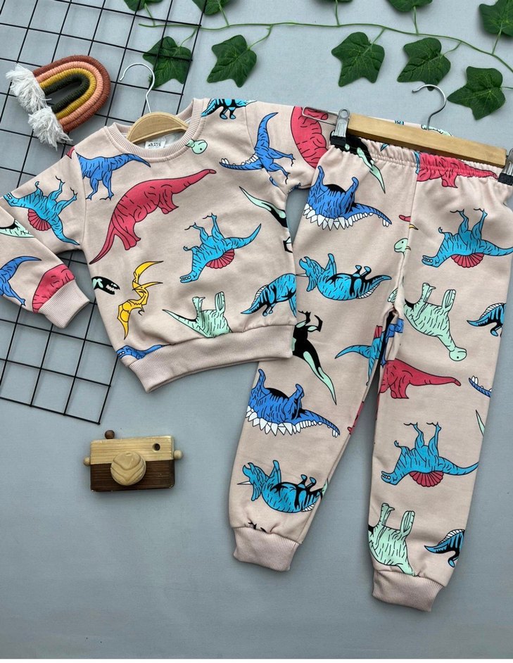 Yumuşak sentetik kumaştan yapılmış, çok renkli dinozor baskılı uzun kollu üst ve pantolondan oluşan çocuk pijama takımı.