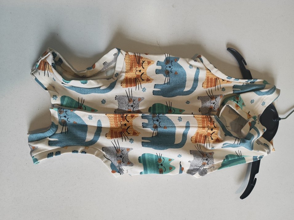 Çok renkli baskılı kedi kıyafeti, elastik yapısı ve rahat kullanımı ile dikkat çeker. Counterculture tarzında tasarlanmıştır.