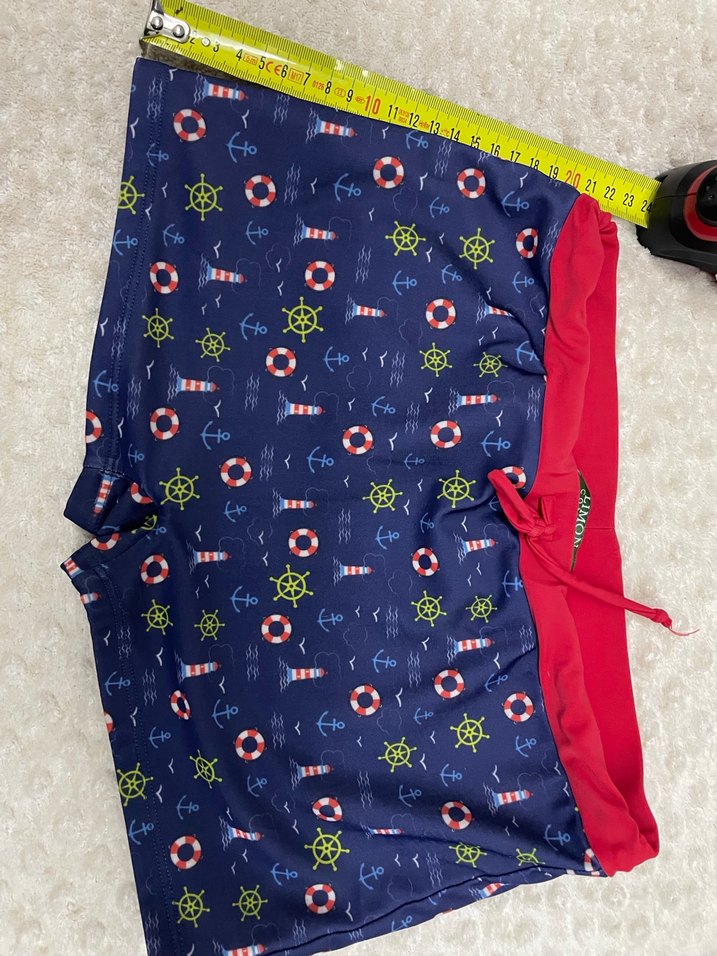 Çapa, can simidi ve deniz feneri desenli çok renkli erkek #çocukmayo, kırmızı bağcıklı bel kısmı ile tamamlanmıştır. Yanında kı mavı mayo hesıye