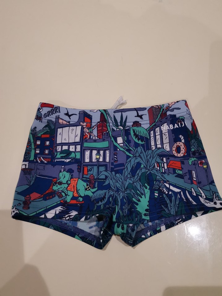 Erkek çocuklar için çok renkli baskılı mayo, canlı şehir ve dinozor desenli, ayarlanabilir bel bantlıdır.