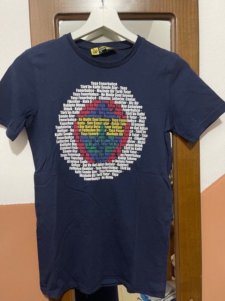 Erkek tişörtü, kısa kollu, yuvarlak yaka ve dar kesimlidir. Koyu çok renkli baskılı tekstil kumaştan yapılmıştır, trend günlük stil için uygundur.