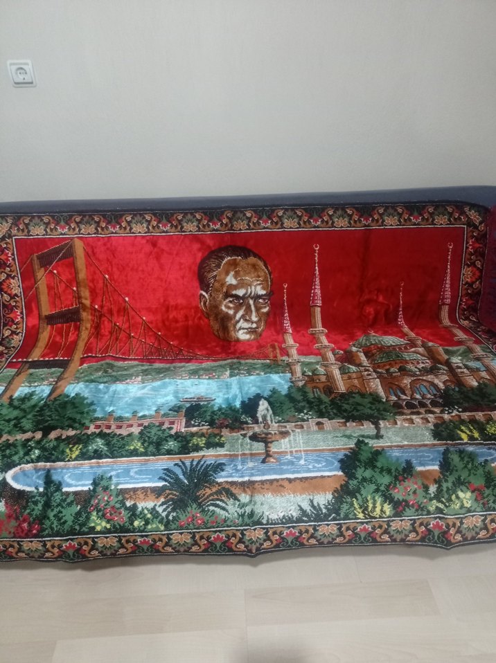 Koyu renkli, çok renkli baskılı desenli geleneksel tarzda Atatürk,manzara ve mimari detaylar içeren antika büyük boy duvar halısı Ölçü sorunuz