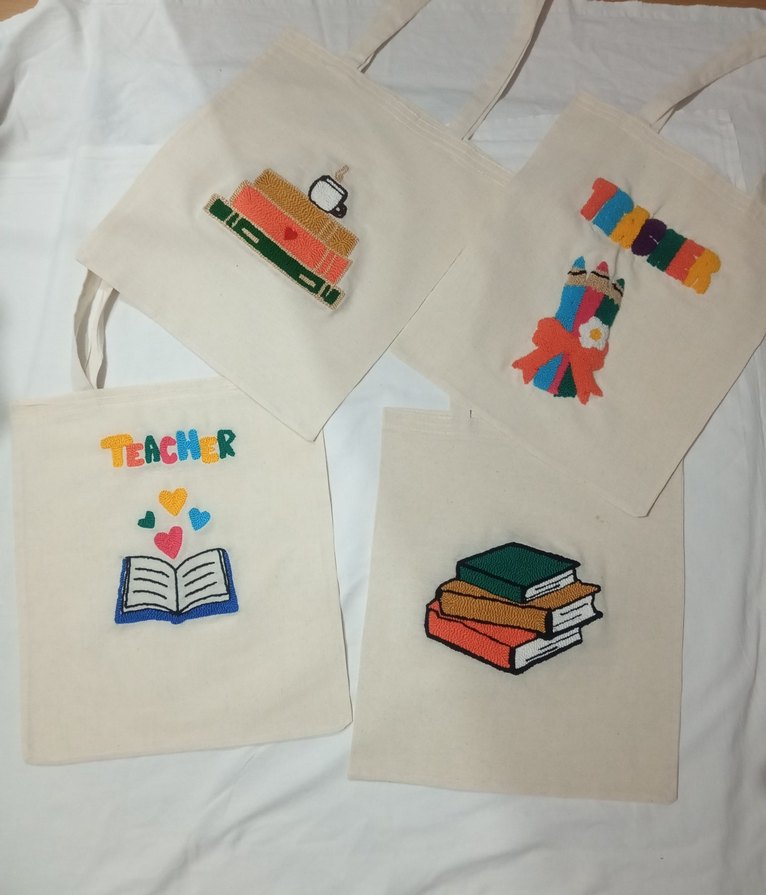 Hafif çok renkli baskılı kitap ve öğretmen temalı kadın bez çantalar, gündelik kullanıma uygun bohem tarzda.
