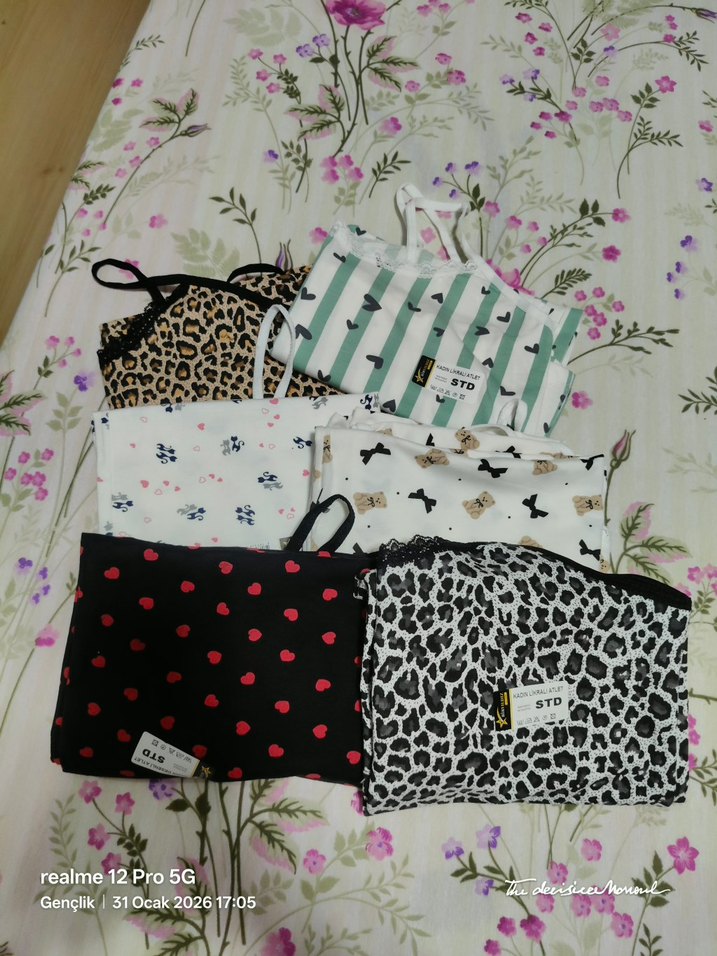 Kadınlar için çok renkli baskılı mini atletler, hafif ve rahat sokak stili desenleriyle sunuluyor. Çizgili, leopar, kiraz ve çiçek baskıları bulunur.
