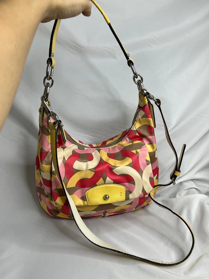 Çok renkli baskılı kadın çantası, fermuarlı kapama ve ayarlanabilir askılarla sentetik kumaştan üretilmiştir. orjinaldir charminda leke var ve üçüncü resimde çektiğim yerde ufak kirmizilik