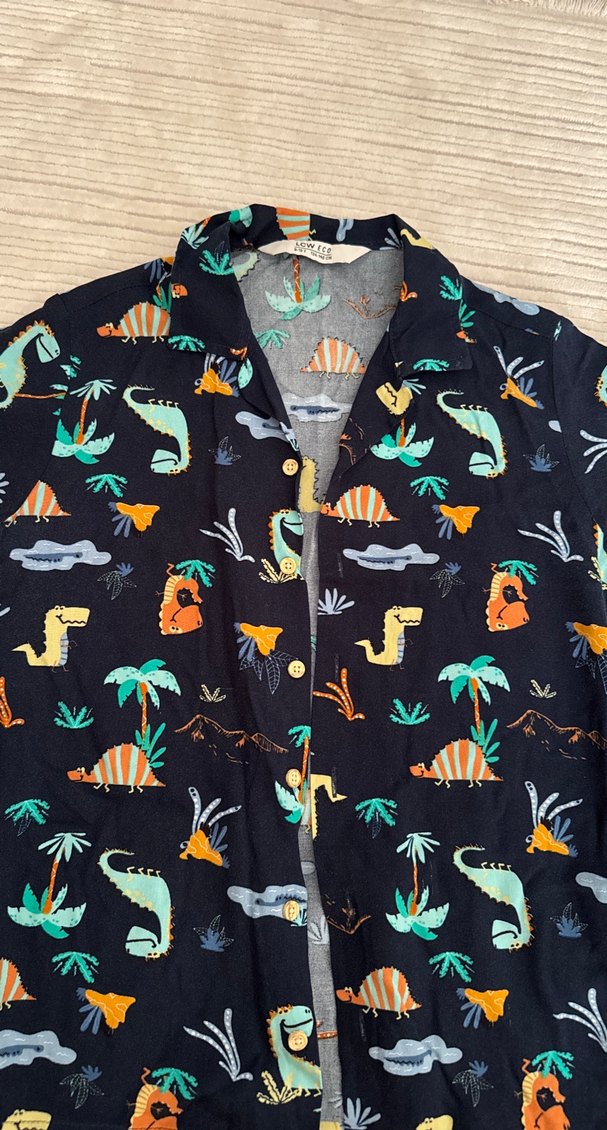 Koyu renkli, çok renkli baskılı desenli, düğmeli, kısa kollu, yakalı ve bol kesim erkek gömleği.