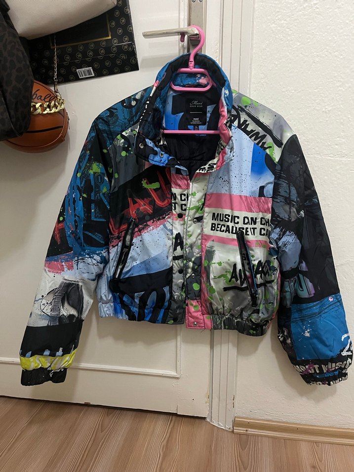 Sentetik kumaştan, bol kesim, uzun kollu, yüksek yakalı ve düğmeli çok renkli baskılı mini kadın ceket. Punk rock havası ve outdoor kullanıma uygun. Çıtçıtlı , deforme yoktur, oversize dursun diye L beden alınmıştı. Makul tekliflerde yardımcı olmak isterim.