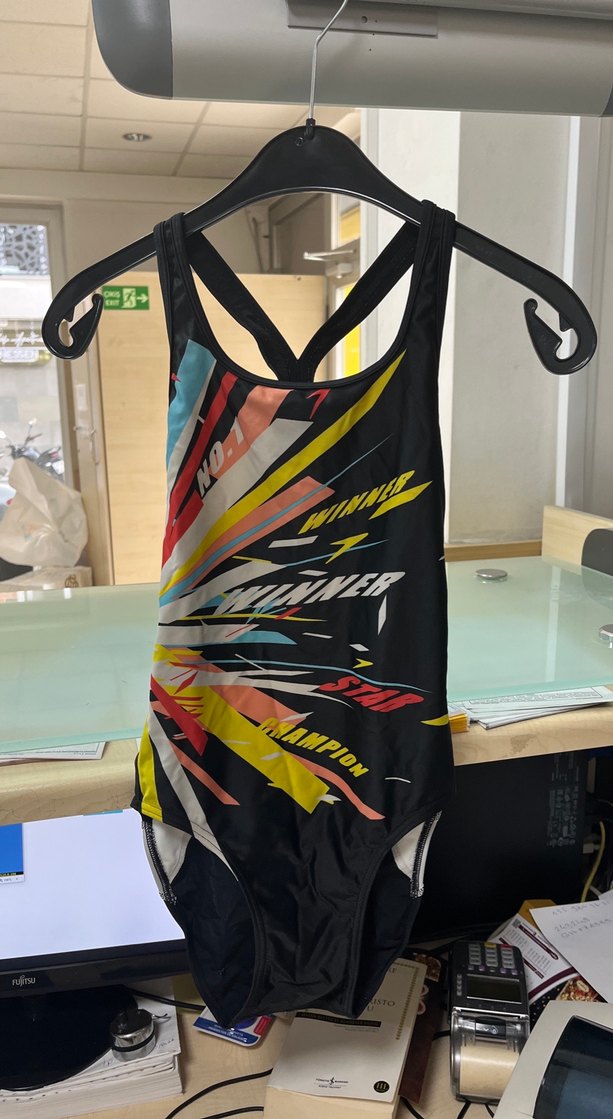 Kolsuz, vücuda oturan çok renkli yüzücü mayosu şezlonda kenara takıldığı için küçük bir dikiş bulunmaktadır