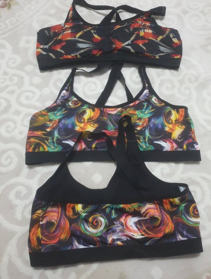 Canlı çok renkli baskılı ve kısa kesim, sırt detaylı üçlü sporcu sütyeni seti. ️