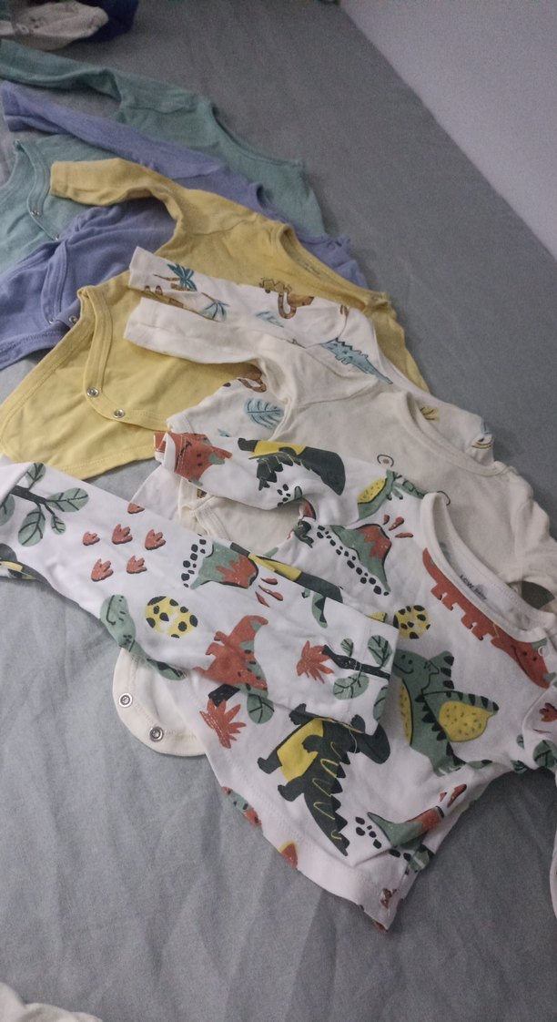 Pastel tonlarda, çok renkli baskılı, uzun kollu ve çıtçıtlı bebek body'leri.