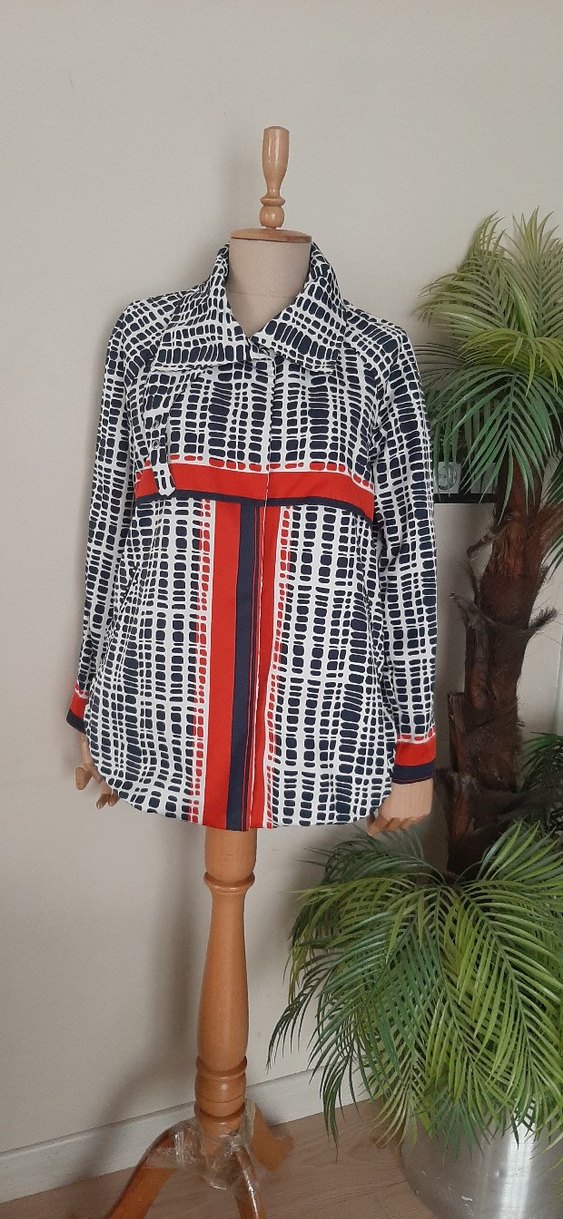 Uzun kollu, düğmeli, yüksek yagmurluk Koyu çok renkli baskılı desenle çağdaş ve Paris tarzı rahat görünüm sunar. Günlük kullanım için uygun.