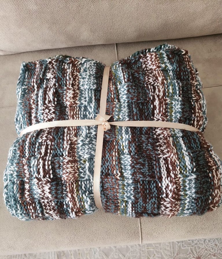 Çok renkli batik desenli kahve tonlarda, dokulu ve yumuşak bir battaniyedir. Sıcaklık ve şıklık katar. ️ 130x126