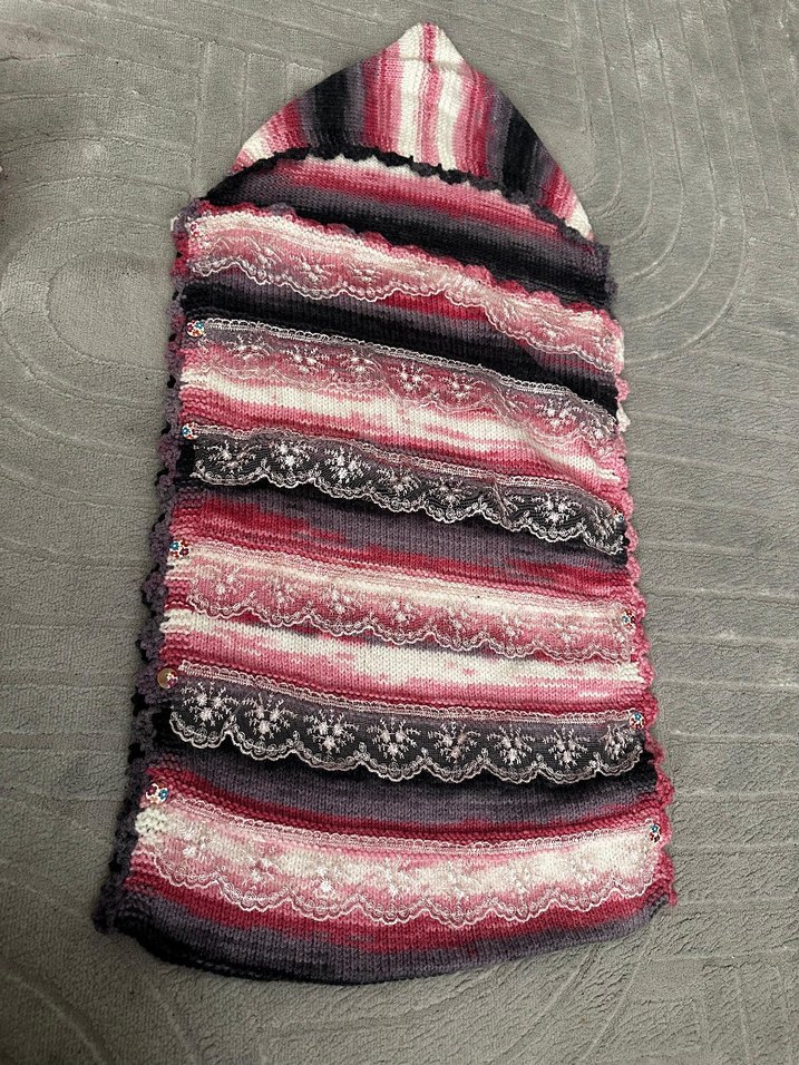 Bu battaniye, koyu çok renkli batik desenli olup, dantel detaylarıyla dokulu ve dekoratif bir görünüm sunar. ️el örmesi yün kundak yandan düğmeli sorunsuz