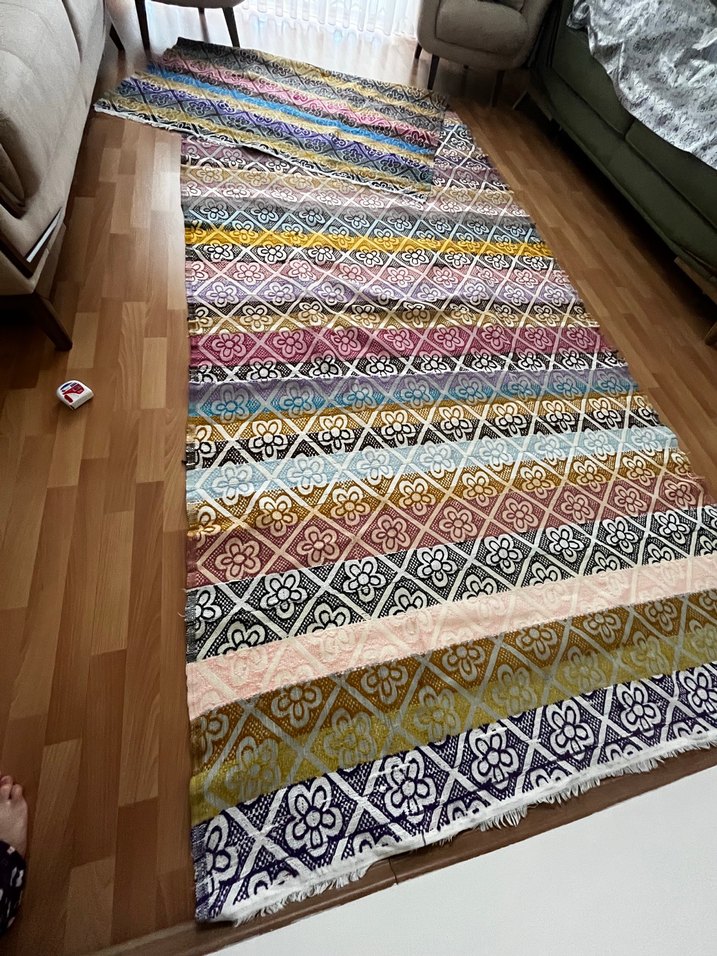 Koyu tonlarda çok renkli batik desenli, çiçek motifli klasik tarzda halı. 465 boy 155 en ölçüsüne sahıptir Hıc kullanılmadı