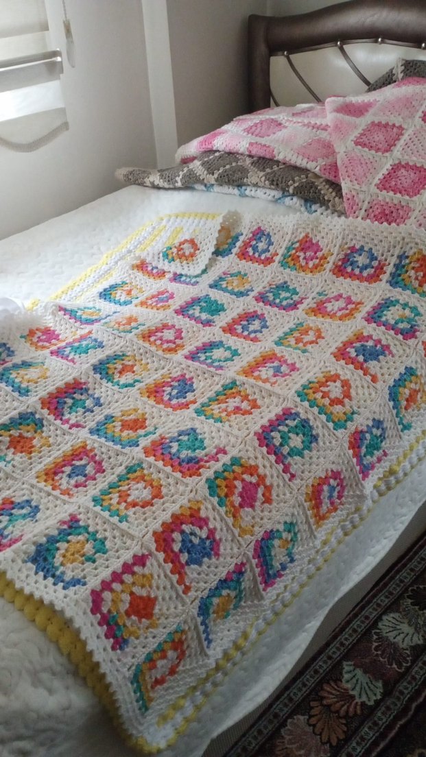 Hafif çok renkli batik desenli örgü battaniye, sıcak ve canlı bir görünüm sunar.