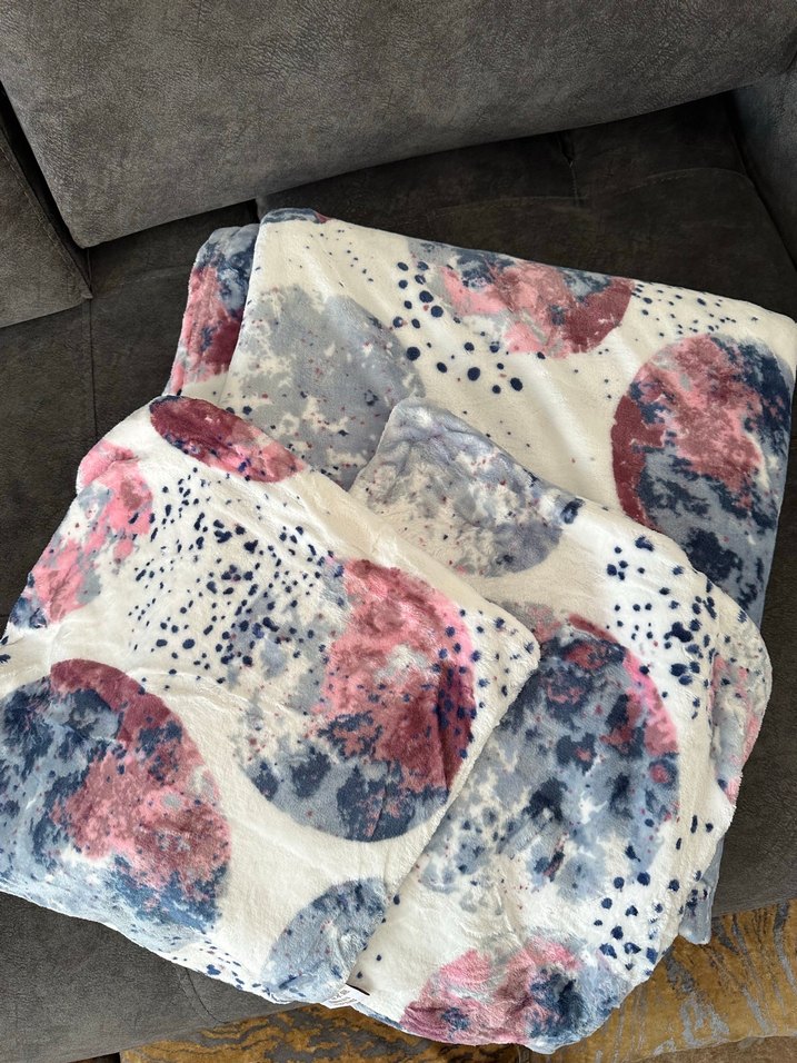 gri ve çok renkli batik desenli, yumuşak sentetik kumaştan yapılmış battaniye. ️ yatak örtüsü, çift kişilik. Kırlent kılıfı da var