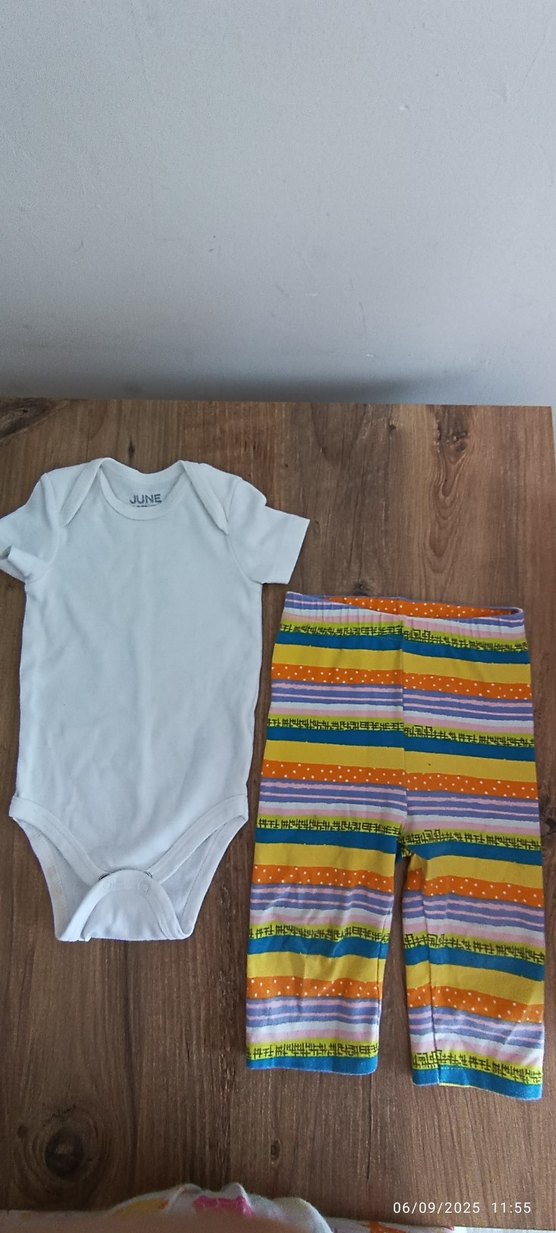 Pamuklu, beyaz kısa kollu çıtçıtlı body ve çok renkli çizgili pantolon içeren bebek erkek takımı. Rahat ve şık tasarım sunar.