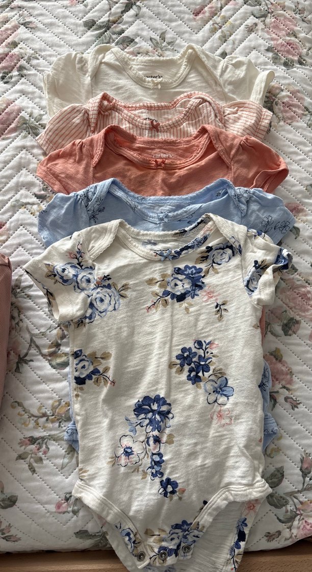 Çok renkli, kısa kollu, düğmeli straplez bebek body seti. Pastel tonlarda, bazıları çiçek desenli, bazıları düz renkli. 3 tanesinde minik lekeler var detaylarda belirttim sadece mavi olandaki net belli oluyor belki leke çıkarıcıyla çıkabilir.