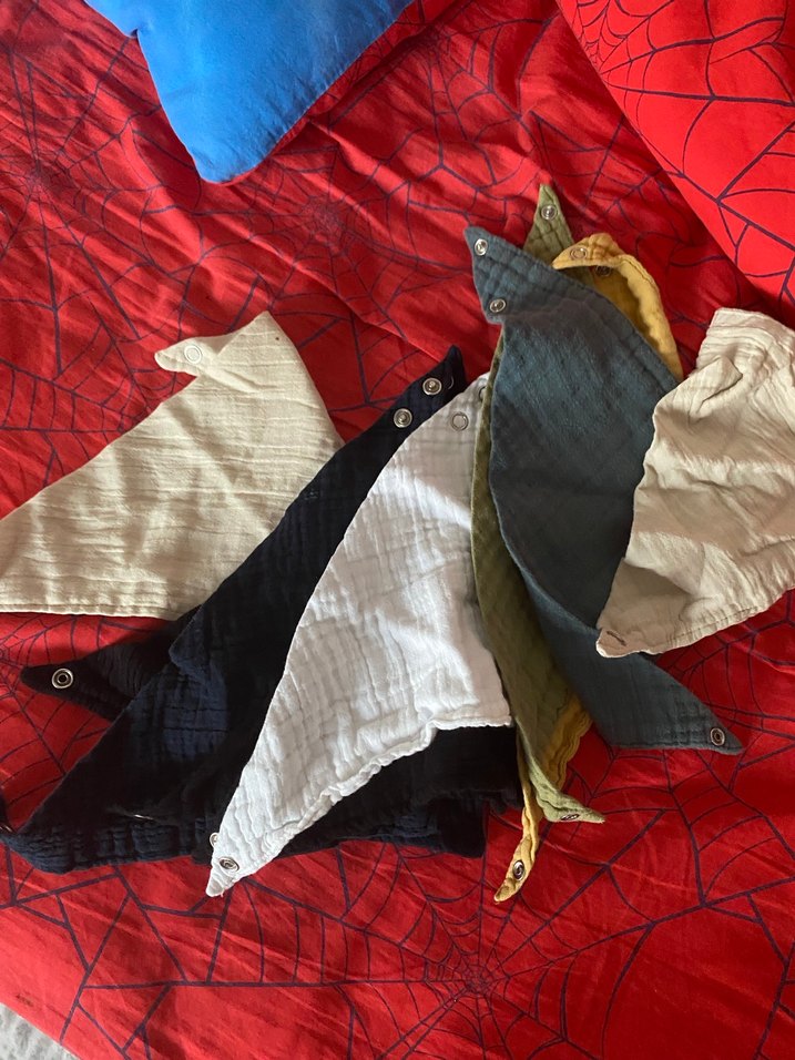 Koyu tonlarda çok renkli bebek önlükleri, yumuşak kumaştan ve kolay kullanımlı çıtçıtlıdır. Desensiz tasarım. Bir kaç tanesi kullanıldı diğerleri kullanılmadı