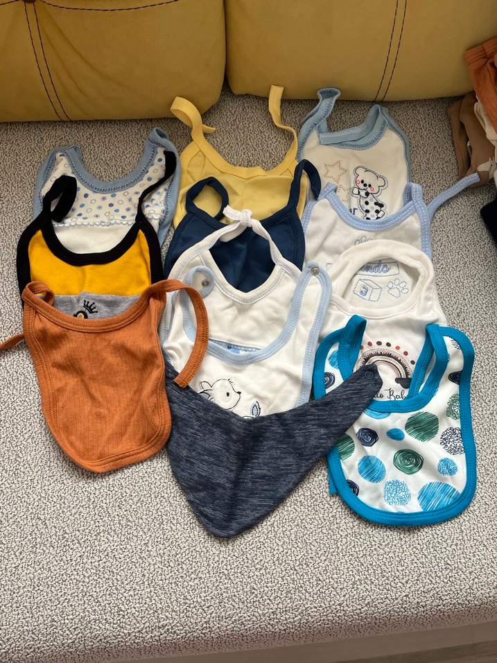 Çeşitli açık renklerde, desensiz bebek önlükleri seti. Bazıları hayvan desenli, farklı düz renklerde tasarlanmıştır.
