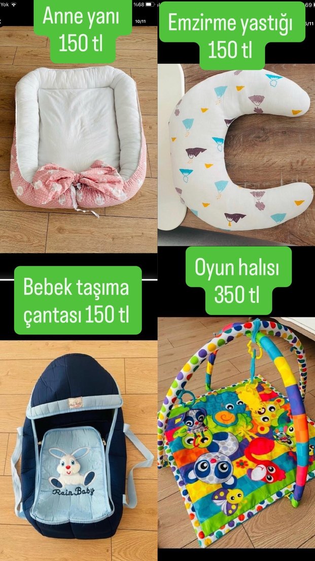 Bebek taşıma çantası ve renkli desenli oyun halısı seti. Bebek taşıma çantası 150 TL, oyun halısı 350 TL. Yumuşak tekstil malzemeden üretilmiştir.